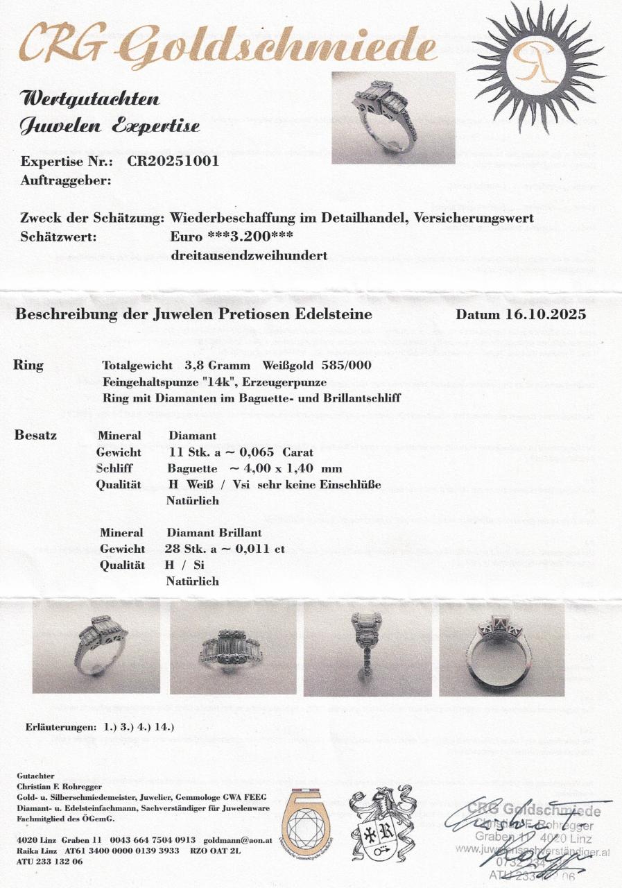 Eleganter Ring aus hochwertigem 14 Karat Weißgold, kunstvoll besetzt mit funkelnden Diamanten im Baguette- und Brillantschliff. Die Kombination der beiden Schliffarten verleiht dem Schmuckstück eine besondere Ausstrahlung: Während die Brillanten für intensives Funkeln sorgen, unterstreichen die Baguette-Diamanten die edle, klare Linienführung des Designs.